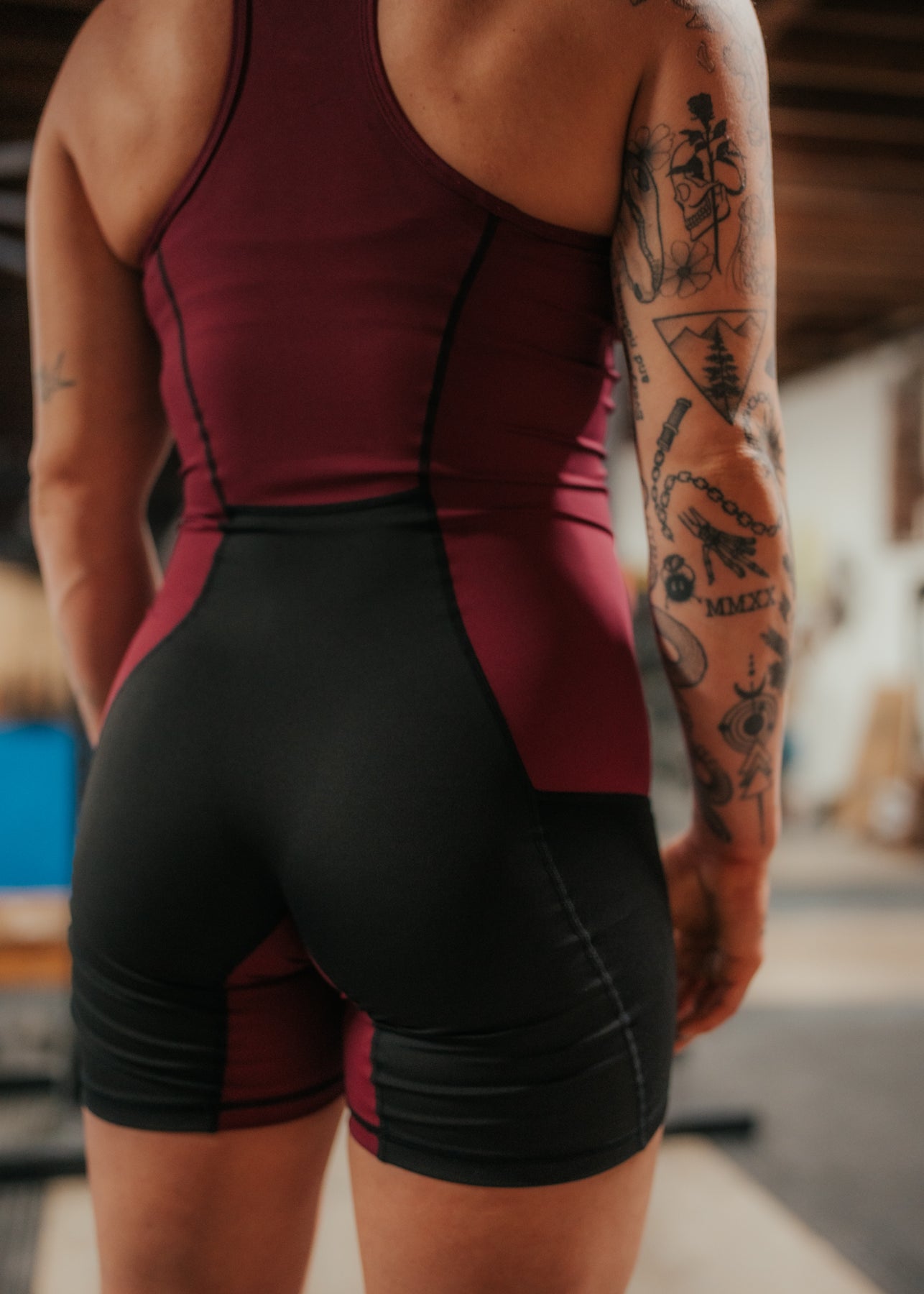 The Boundless Singlet is guaranteed to make you feel comfortable and confident on stage. Created to fit every body type so you can focus on your lifts instead of pulling and tugging on what you're wearing. NEW in maroon and black with minimal branding, the Boundless Singlet is a perfect blank canvas for adding your teams logo and athlete names, or just as is for a sleek, clean look. Available in 8" inseam. Durable front thigh panels to keep scraping and tearing to a minimum as you keep that bar close, a higher-than-standard neck rise & flattering seams across the back to keep you locked in.